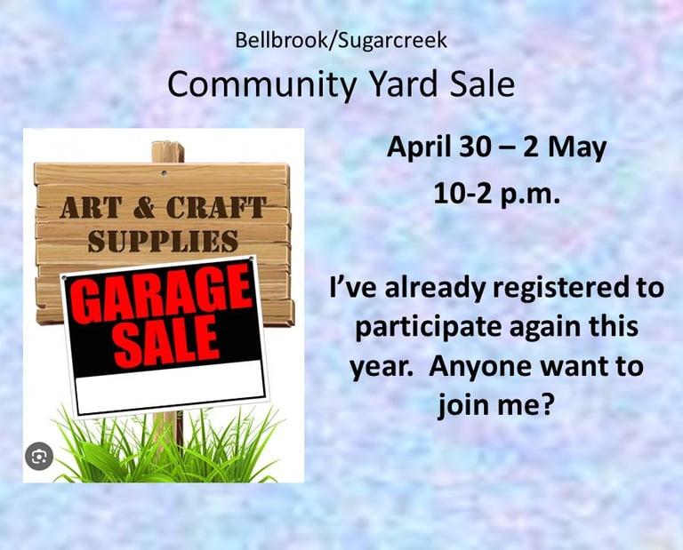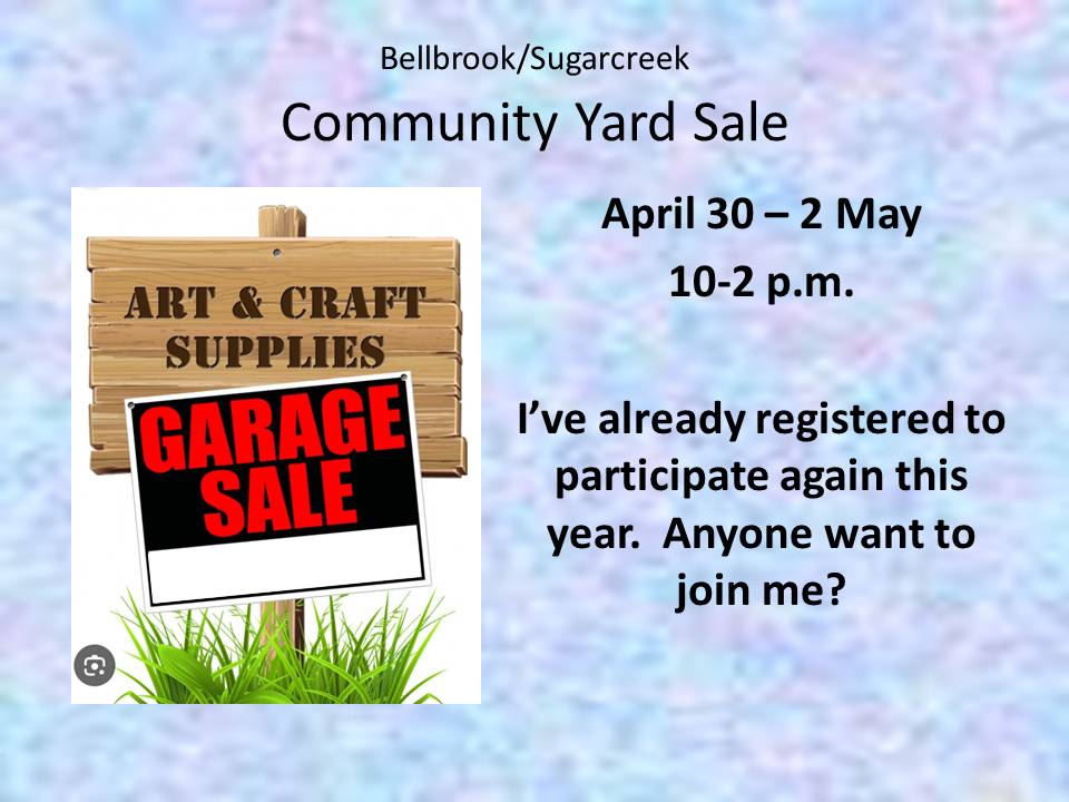 The Bellbrook/Sugarcreek Chamber of Commerce is hosting the annual Community Yard Sale. I've registered and am inviting you to bring you to join me! Please let me know if you are interested.